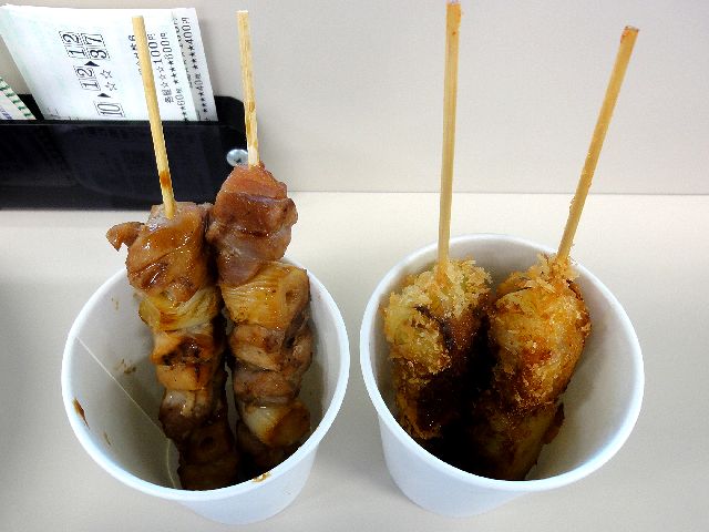 こちらは、一緒にいただいたもの。串焼きは、間に挟んであるネギと相性がバッチリ(当然っちゃ当然ですけど)で、甘みの少ないタレが個人的に好印象。日本酒が欲しくなりますね。あと串カツは、フライにするとマグロが「肉」っぽい味に感じられるのが不思議。こちらはビールが欲しくなります。