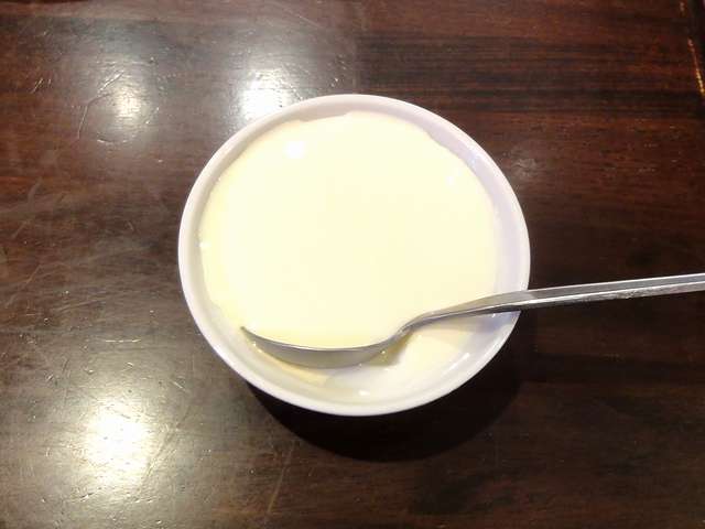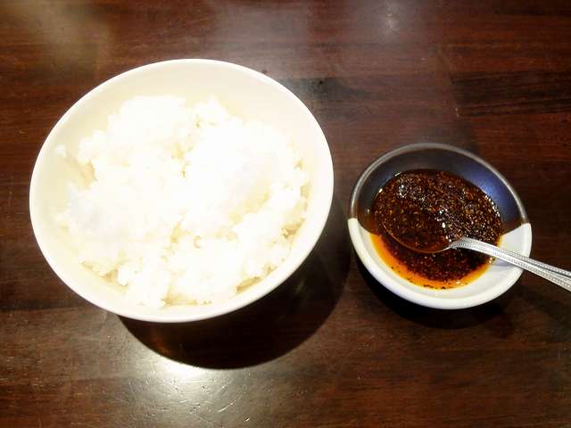 (付属のラー油と、ランチメニューに付く半ライスと杏仁豆腐)