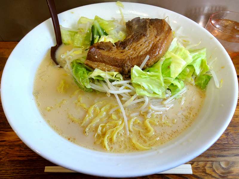 いただいたのは、個人的にこちらで一番好きなこちら。実は裏メニューだったりする(店内のお品書きには書いていない)のですが、皆さん結構普通に注文していたりします。で、登場すると、以前と変わらぬビジュアルに一安心というか、相変わらずの巨大な丼に、かなりのボリュームのラーメンが入っています。(写真だと丼が大きいお陰でそうは見えないかもしれませんが。)まずはスープを一口啜れば、サラッとしているけどスパイシー、そしてミルクのコクとまろやかさが、何とも良い感じ。麺は、ピロピロだけどコシもある平打ち麺。そして具は、ホロトロの豚バラと、大量の茹でモヤシandキャベツで、これらが一体になった味は、まさしく久しぶりにいただくこちらならではのお味。やっぱり旨いよなぁ。また途中から、卓上のラー油にニンニクとショウガの入った調味料を投入すれば、これもまた良し。久しぶりなのでそのボリュームにやられそうになりつつも、何とか完食・完飲することが出来ました。