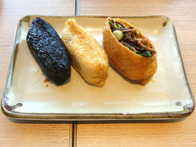 【左から】 飾りいなり(山菜) 150円、いなり寿司 100円、竹炭いなり(梅ひじき飯) 120円