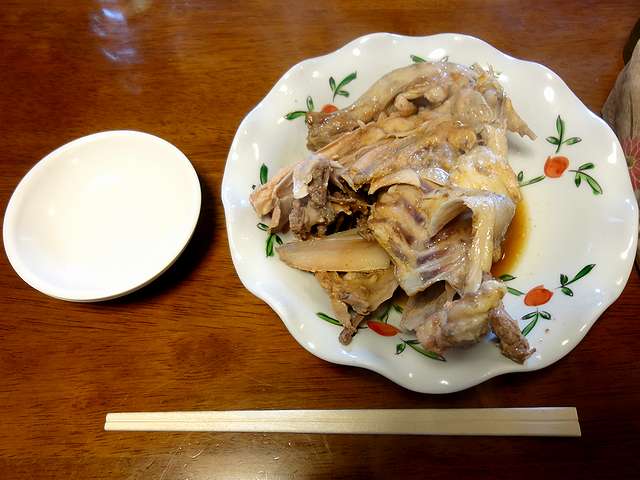 それでお店に入ると、お冷やと共に「よろしかったらどうぞ」と、スープのダシに使った?鶏ガラが出てきました。で、見た目は正直ちょっとアレなのですが、これが以外な美味というか。後述のラーメンの注文を済ませ、早速いただいたのですが、ふっくらしたお肉には鶏の旨味がまだまだ残っています。それを、しばし夢中になってつついていると、やがてラーメンが登場しました。