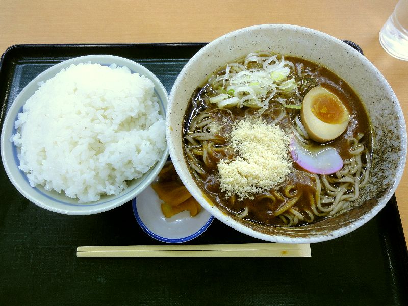 まずはカレーそばですが、かけそばの上にカレールーがかかったタイプで、その上に振られた粉チーズと、半個分入る煮卵が珍しいですね。で、つゆは、ベースとなるそばつゆの塩気がかなり抑えめな感じで、そこにカレールーが加わっても全体としては個人的に若干物足りないというか、もう少ししょっぱい方が好みなんですが。特にこのセットはライスもあるので、より一層そう感じます。もっとも、そんなことは思いつつも、蕎麦もライスも全て平らげれば、結構満足してしまったのですが。
