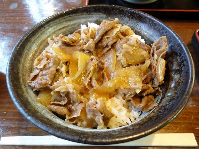 こちらは、いっしょにいただいたもの。見た目どおり牛丼なのですが、盛り的には、大手チェーン店の並盛りよりちょっと軽いくらいで、お味の方は、変に特徴的でもないというか間違いがない味。釜揚げうどんだけだと(その時かなり空腹だったこともあり)ちょっと物足りないと思ったのですが、こちらと一緒にいただくと丁度良かったです。ちなみに、前述の無料サービスのお新香の中には、紅ショウガもありますのでというか、個人的に、牛丼には紅ショウガ必須なもので嬉しかったです。