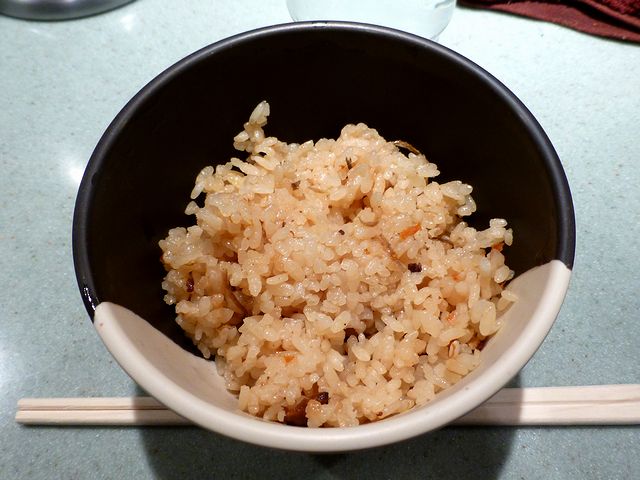 こちらは、一緒にいただいた物。醤油が効き、甘味は控えめの、あっさりとした鶏の炊き込みご飯です。