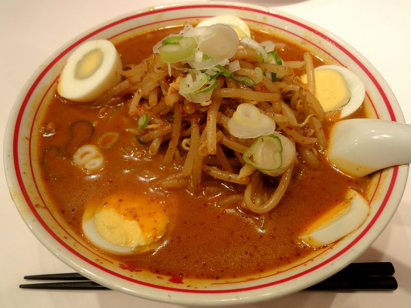 実はこちら、昔から気になってはいた品なのですが、今回初めていただく事に。ちなみに写真だとさほど辛そうに見えないのですが、よく見ると、スープにも具のモヤシにも、赤い唐辛子の粒がたくさんあるのが確認できます。で、ままよとばかりに一口啜ったスープは、かなりハードな辛さ。ベースのコクのある味噌スープに唐辛子の辛味がズバババババーン!!という感じなのですが、個人的な感覚では味わえる限界をちょっと超えている気が。昨年いただいた、中本さんの公式サイトでは同じ辛さ度8となっている冷し五目蒙古タンメンよりも、こちらの方がかなり辛い気がします。また麺は、どうしても「中本の麺」という表現になってしまう独特の食感の物。スープから持ち上げると唐辛子の粒が(北極ラーメン程ではないにしろ)沢山付着するので、そのまま勢いよく啜ると大変な事に。そして具は、モヤシと豚肉とニンニクスライスを炒めた物。こちらも炒める時に結構な量の唐辛子を使用しているので、スープに浸かっていていない部分も結構な辛さがありました。また、ゆで卵のスライスは2.5個分載っているそうなのですが、途中から辛味をマイルドにすべく半分くらい残っていた黄身をスープに溶いたところ、個人的には焼け石に水状態でした。(もっと残しておけば良かったかなぁ。)