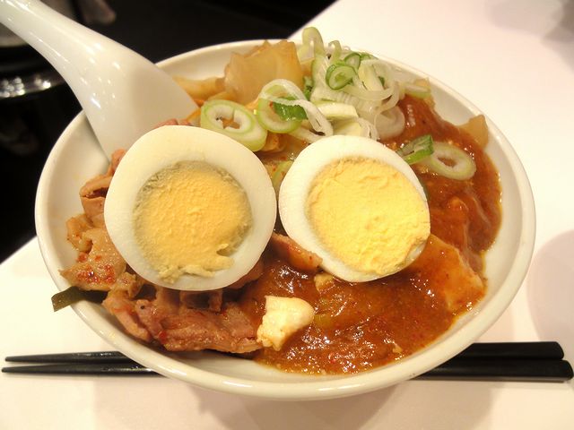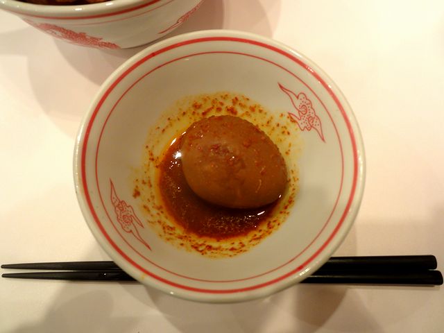 こちらも一緒にいただいたもの。ちなみにご飯の上に載っているのは、こちらの名物である蒙古タンメンの具である、麻婆豆腐(蒙古麻婆)とクタクタの野菜の他、辛い豚肉にスライスゆで玉子と紅生姜。それでまずは混ぜずに個々の具のところをいただいたり、途中からは具を混ぜ合わせていただいたり、更には北極玉子の汁を混ぜて楽しんだりして、最後は味噌卵麺のスープを投入。ぐちゃぐちゃに混ぜると、見た目はカオスですがかなり旨かったです。それにしても、半と付いてますがかなりボリューミーですね。