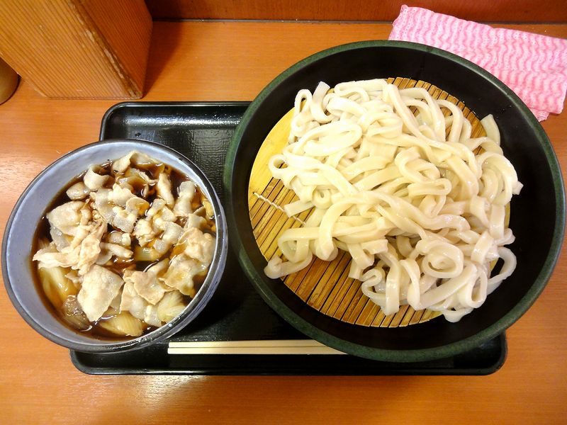 で、いただいたのは、4種類あった武蔵野うどんの中から、「定番」と書かれたこちら。付け汁の器の中には、煮込まれた豚肉とネギが水面上まで入っていてうどんを浸けるのにはちょっと難渋するのですが、それを物ともせずにぐいぐいと浸けていただくと、うどんは茹で置きながらも結構シコシコとした食感。いかにも澱粉添加してます的な不自然な感じもあまりなく、最近の技術の進歩を感じるというか。また付け汁は、前述の豚肉とネギの旨味が感じられ、甘味も控えめで悪くない味加減。前述のとおり具もたくさん入っているので、結構食べ応えもあります。580円と駅の立ち食いとしては強気な価格設定も、高速道路のSA・PAに較べれば安いとは思いますし、値段相応の満足感というか、結構良いなぁ、なんて思ったりしてしまいました。