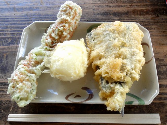 天ぷら 各100円 (左から竹輪の磯辺揚げ・玉子・イワシ)