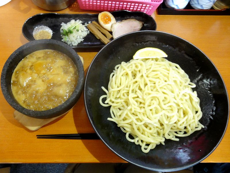 で、いただいたのは、つけ麺を、このような組み合わせで。ちなみに、自家製麺される麺は7種類(デフォルトが4種類でこの日の特別麺が3種類ありました)、無化調を謳う付け汁は3種類(濃厚魚介トリプルスープの他、赤鬼(チゲ辛旨)スープ、豆乳ごまスープ)から選べ、更には、麺の量は300g、400g、500g全て同料金。あと、つけ麺のスープ1杯までおかわり無料という、何というか、ものすごいサービス精神でぐいぐいと迫ってきますね。やがて、待つ事暫しで登場したそのつけ麺。 座ったカウンターの広さに対してかなり大きなお皿に入った麺は、この日の特別麺の中から「つるっとしこしこ食感」という『つる麺』をチョイス。結構太めで密度感があり、硬質な弾力が感じられる歯応えですね。付け汁は、最初に味見した濃厚豚骨白湯に、魚介系がたっぷりと効かされ、更には、ベジポタ系も合わさった物。最近採用しているところが多い石焼き系の容器に入っているので最後まで熱々でいただけるのですが、受け皿が小さいので、容器を動かそうとする時は要注意です。具は、別皿に盛られたチャーシュー、味玉、メンマなのですが、どれもそつなく作られたという印象の物。あと薬味系のタマネギとカイワレは、濃厚な付け汁によく合っていますね。そして、レモンやカレーフレーク、また卓上に置かれた辛ニラなどで途中から味を変えられるというのも親切だと思いました。