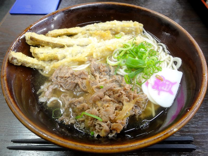 そこでいただいたのはこちら。注文の際、はじめは一番人気と書かれた肉ゴボ天うどんにしようと思っていたのですが、お品書きに『細(さい)めん』というものを発見し興味を惹かれたので、土壇場で(肉ゴボ天まで言った後で)そちらを注文しました。で、注文後、少し待って登場したそのうどんというか細めん。まずはつゆからいただくと、だしの香りがちゃんとして、旨味も豊か。お店のウェブサイトを見るとメインのだしは節系のようですが、イリコっぽい風味も結構感じられました。また味付けは、まろやかというか、当地の甘味のある醤油を使用していたように感じられたのですが気のせいですかね。そして細めんは、当たり前っちゃ当たり前なのですが、「細いうどん」という食感。歯応えは適度というか自然な感じで、啜り心地が良いですね。ちなみに細めんのお勧めは冷たい系のメニューだそうですが、温かい品のこちらでも悪くない感じです。それから具のゴボ天は、ゴボウが風味良く、またかなりの噛み応え。それと牛肉は、共に極薄に切られたタマネギと甘辛く煮てあったのですが、これは間違いがないお味というか。あと途中から、卓上のとろろ昆布を投入(ちなみに、とろろ昆布と天かすは無料で入れ放題です。)すると、これもまた良い感じでした。
