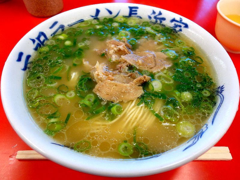 それで、(帰りの便を考えての)北九州空港からレンタカーでまずは博多へ。長浜の魚市場近くの有料駐車場にクルマを停めて向かったのが、長浜ラーメンといえば真っ先に名前が挙がるであろうこちら。ちなみに今回いただく長浜ラーメンというのは、博多の一般的な豚骨ラーメンと微妙な違いがあるらしく、元々長浜の魚河岸で働く人々のために特化したもので、スープは豚骨白湯なれど濃厚系ではなくあっさりとした味で、更に、いただく際は卓上に置かれるタレで味の濃さを各々調整する事と、麺の固さ指定の用語も「カタ」とか「ヤワ」は長浜以外の博多ラーメンと共通ですが、カタより更に固くしたい場合は「バリカタ」「ハリガネ」「コナオトシ」(って言っても通じないお店もあるそうですが。)ではなくて「ナマ」と言うような特徴があるそうです。