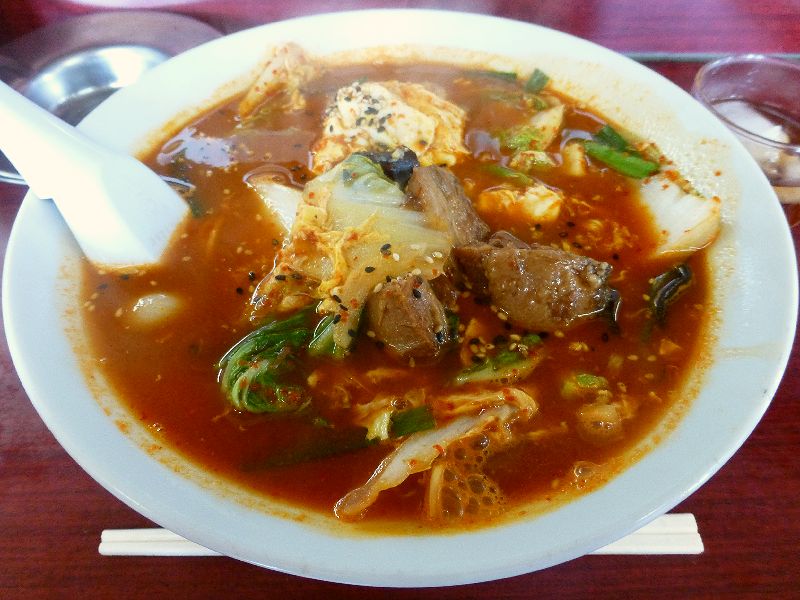 というわけでそんな中いただくのは決まっているのですが、券売機で食券を買う際、隣の(大辛)と書かれたテグタンラーメンともちょっと迷ったりして。ちなみに、カウンターで隣に座ったオッサン達など、店内のお客さんの半分近くはカルビラーメンを注文していたようです。で、食券を出し、出されたお茶のバニラっぽい風味に驚いたのもつかの間、かなり素早いタイミングでラーメンが登場しました。それでまずは赤々としたスープからいただいてみると、確かに辛いですが、味付けに使用されるという発酵味噌のコクや具の野菜類の旨味も感じられます。そして何より、個人的に一番感じたのは、かなりの味付の濃さというか。しかも、甘みはさほど効かされておらず、かなりの"剛"の味。ちなみにこういう場合はお酢を入れると味の濃さがマイルドになるのですが、こういった辛いメニューの場合、辛味もマイルドになってしまうのが悩ましいところで。また麺は、中くらいの太さの縮れ麺。わりと硬質な食感です。あと具は、ホロトロに煮込まれた甘辛い牛肉がゴロッと。ほかは、カルビラーメンの定番的な具というか、ニラや白菜、人参、キクラゲなどの野菜と溶き卵でした。