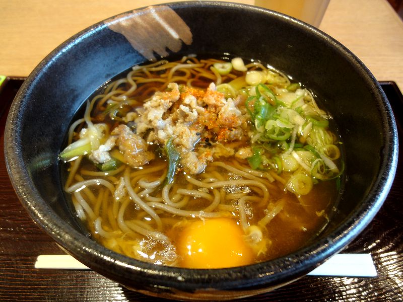 そこでいただいたのは、いつもの天玉ではなくこちら。で、そばの上にネギと共に甘辛い味付けで煮た豚肉が載っているのですが、そのネギと豚肉の風味が結構主張していたのですが、つゆ、そしてそばとも良く合っていますね。また、味の濃さも申し分なく、追加した生卵も結構合いました。