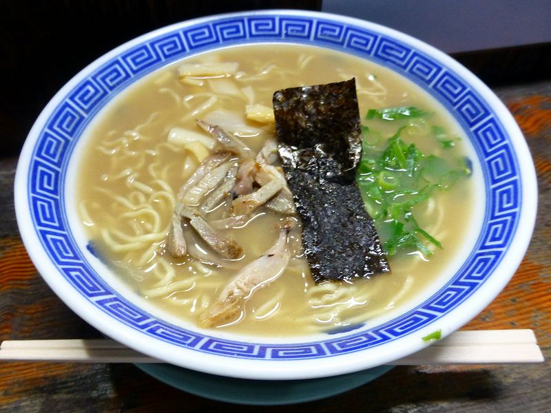 それでいただいたのは、当然その元祖豚骨なラーメン。まずスープからいただくと、豚骨の旨味は感じつつも、かなりのあっさり味。ちなみに、こちら創業当時のラーメンは豚骨ダシの清湯スープだったらしいのですが、それをそのまま白濁させた感じの味というか。個人的には今までいただいた事のない味ですが、これはこれで旨いですね。そして麺は、中くらいの太さの平打ち縮れ麺で、むっちりとした食感です。また具は、シンプルな味付けのチャーシューとメンマ。そして、ノリとネギとシンプル。短冊に切られたチャーシューや、豚骨ラーメンなのにメンマが入るところが、今日では珍しいというか。また、豚骨ラーメンにつきものの紅ショウガですが、こちらには置いてありません。初代店主の「合わない」との思いかららしいのですが、このあっさりしたスープには、確かにそう思います。