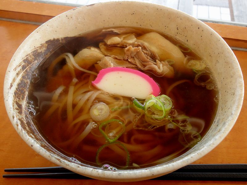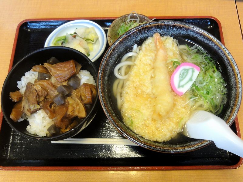 お品書きを見ると豊富なメニューに何をいただこうか迷ったのですが、結局はこちらの人気メニューである天ぷらうどんとミニ牛すじ丼がセットになったこちらに。で、まずはうどんですが、利尻産昆布と高級鰹節の使用を謳うつゆは、ちゃんとだしの香りがして、旨味、塩気とも十分。うどんは、人によっては柔らかく感じるかもしれませんが、個人的には変なコシや歯ごたえがなく、素直な食感が良いですね。また 具の天ぷらは、小さいエビを中心に衣で巨大化させた、大阪あたりの立ち食いうどんでよく見かけるスタイルの物。値段を考えればこれで十分です。またかまぼこは、こちらの会社が羽咋で創業した為か、UFOがあしらわれていました。それと、ミニ牛すじ丼ですが、牛すじはトロトロではなくプリサクっとした食感。個人的には、甘さ控えめなスパルタンな感じの味という印象です。
