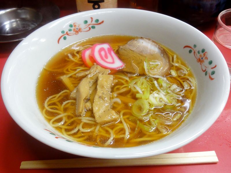それでいただいたのは、ベーシックなこちらの品。まずスープは、醤油の香りがふわっと前面に感じられ、後ろに控えるダシは和風とのことですが、ガラ系のような旨味や野菜由来?の甘みも。(この辺は酔っぱらっていたので、少々記憶が…。)また麺は、ツルツルっとした食感。こちらに来る前、居酒屋さんをハシゴしてお腹は結構ふくれていたのですが、それでも、身体の中にスルスルっと入ってきます。そして具は、赤巻きが当地らしいのですが、歯ごたえのあるチャーシューや、一捻りした感のあるメンマが、ちょっとした存在感というか。