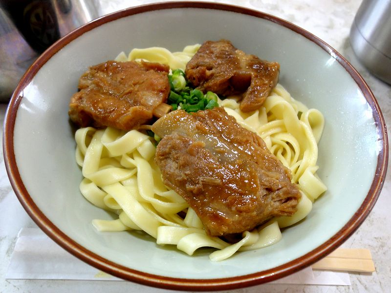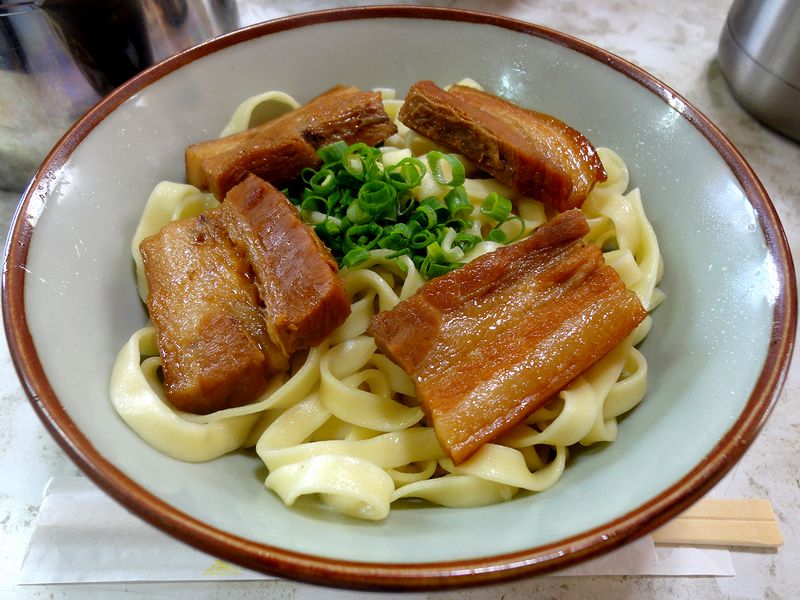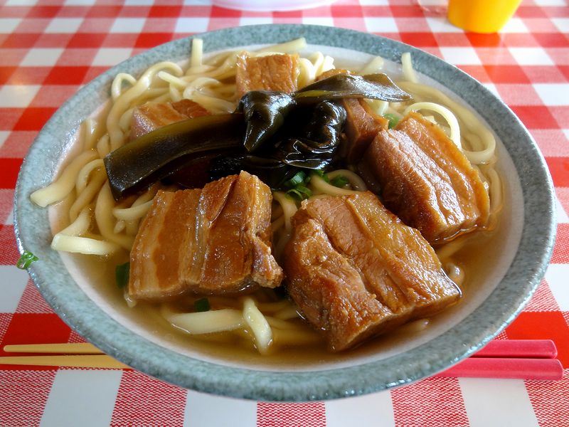 そんな所で、お店にはちょっと似つかわしくないと思った券売機で食券を購入していただいたのはこちら。まずはつゆからいただけば、鰹の香りに豚骨の旨味が合体し、そこに若干甘みも感じられる、何とも気取らないというか、わかりやすい美味しさ。またそばは、平打ちで中くらいの太さ。固すぎず柔らかすぎず、何とも良い頃合いの食感です。そして、たっぷり載る具の三枚肉は甘じょっぱくて適度に柔らかいです。あとは、とろっとした食感の、沖縄そばの具としては珍しく感じた昆布も、良いアクセントになっていますね。というわけで、全てにおいて丁度良いというか、これが、こちらのお店が昔から、地元の人だけではなく、私のような旅行者にも愛されている所以かなぁ、なんて思いました。