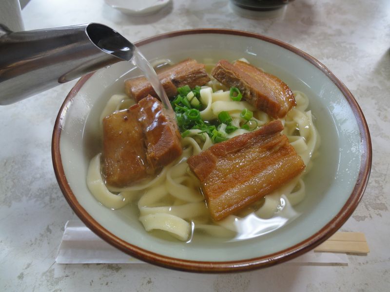それで、こちらのお店のそばは結構特徴的なのですが、その最たるものが、スープは最初から丼に張られておらず、ヤカンにたっぷりと入ったそれを、各自適宜注いでいただくというスタイルではないでしょうか。この方法は、つゆが冷めにくく、また、たっぷり飲んで欲しいということで、こちらのお店の創業者で、お店の名前にもなっている八重さんという方が考え出されたそうです。で、そのつゆですが、鰹と、特に昆布が薫るあっさり味。ですが、あっさりととした中にも滋味深い味わいがあるというか、これは美味しいですね。またそばは、きしめんを思わせる幅広の平打ち麺。沖縄そば独特の食感を残しつつも、結構柔らかめな食感なのですが、このピロピロ感がつゆと非常に合っていますね。そして具の三枚肉は、しっかりとした味付け。つゆとそばが優しい味なので、このしっかり感が丁度良いバランスというか。でも、そんな中にも、こちらのつゆやそばに通じる、何とも優しい感じがするんですよね。