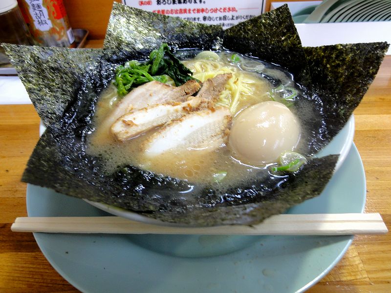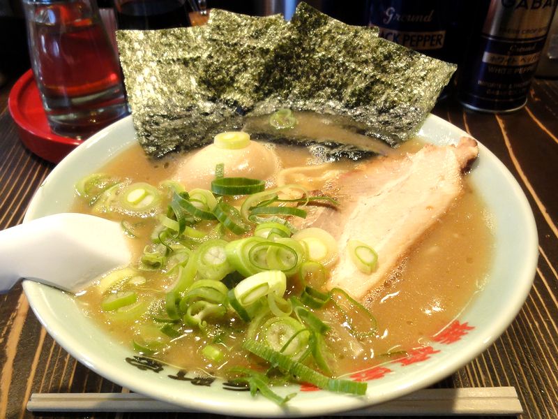 いただいたのは、ラーメンに半熟煮卵を追加して。ちなみに、味の濃さ、油の量、麺の固さは特段指定しませんでした。まずはスープからいただくと、豚骨に鶏が加わった、家系のコッテリ味。タレの加減も丁度良いですね。で、どうして宇都宮の元町家と比較してしまうのですが、自然な甘味というか丸味を感じる所なんかは同じような方向性に感じられますが、濃度はこちらの方が軽めじゃないかと。でも、旨いスープだと思いますよ。また麺は、家系でお馴染みの中太ストレート麺。茹で加減も丁度良く、モチモチとした食感が良いですね。そして具は、トロトロ系チャーシューに、スープと大変良く合う香ばしい海苔、そしてこれまた良く合う九条ネギが何とも。また、追加の半熟煮玉子は、大半がゼリー状で中心部がトロっとした黄身の具合と、良く染みた味加減が何とも絶妙でした。それから、卓上にはニンニクの他、自家製豆板醤と、家系では珍しい魚粉が置いてあるのですが、どれも良く合いますね。(特に魚粉は、当たり前ですが結構キャラクターが変わって面白かったです。)