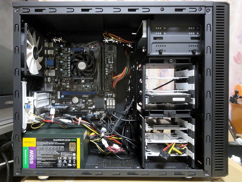 まず、組み付けについては、ケースが(Micro-ATXにしては)大きいので、特に苦労は無し。(前回はそこでだいぶ苦労したんですがね。)ちなみに今回、初めて裏面配線のできるケースを使ったのですが、配線が楽で見た目もスッキリ出来るので良いですね。ですがこのケース、作りがカッチリしすぎというか、サイドパネルの開閉にかなりの力が要るのには、ちょっと参ったというか。あと、フロントパネル以外のケース表面が細かくざらついているので、触れたところに皮膚の角質がついてすぐ白くなっちゃうのもちょっと(気にしなきゃ良いんですが)。