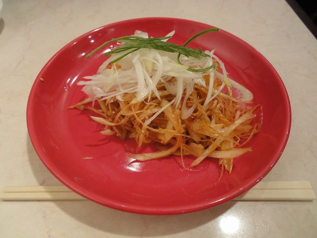まずは、つまみネギをアテに生ビールで乾杯。豆板醤で和えたと思われるピリッと辛いねぎが旨いです。