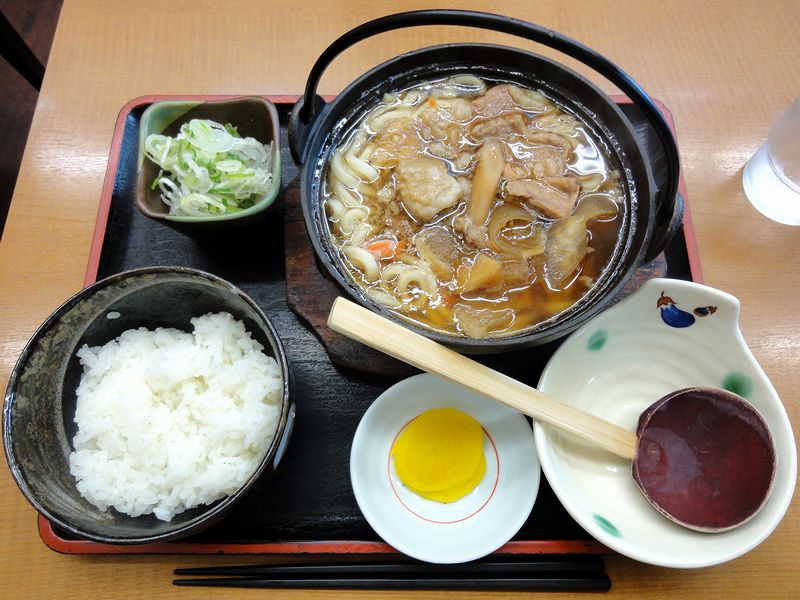 登場したのは、鉄鍋に入ったうどんのほか、小鉢にたっぷりと入ったねぎ、そしてライスのセット。まずは小鉢のねぎを投入した後、汁からいただいてみたところ、具の根菜類や牛すじ肉の風味が溶け込んでおり、また、醤油と砂糖を使った甘しょっぱい味付けが充分に飲める濃さでなされていました。饂飩は、コシを強化したタイプですかね?個人的にはもっと柔らかく、味が染むまで煮込んでも良いくらいに感じましたが、強化タイプの饂飩って、煮込んでも柔らかくならないんですよね。そして具は、「国産牛すじ肉と地元小美玉市産根菜類を味がしみ込むまでじっくり煮込みました。」との事ですが、確かに、味の染みた根菜類、個人的には特に大根が良かったですね。また牛すじ肉も、一部大きく硬いのも混ざっていましたが、おおむねトロっと煮込まれていました。そして最後は、残った汁をライスに掛けていただいたのですが、これがかなり旨かったですね。ボリュームもあって、お腹も満足いたしました。