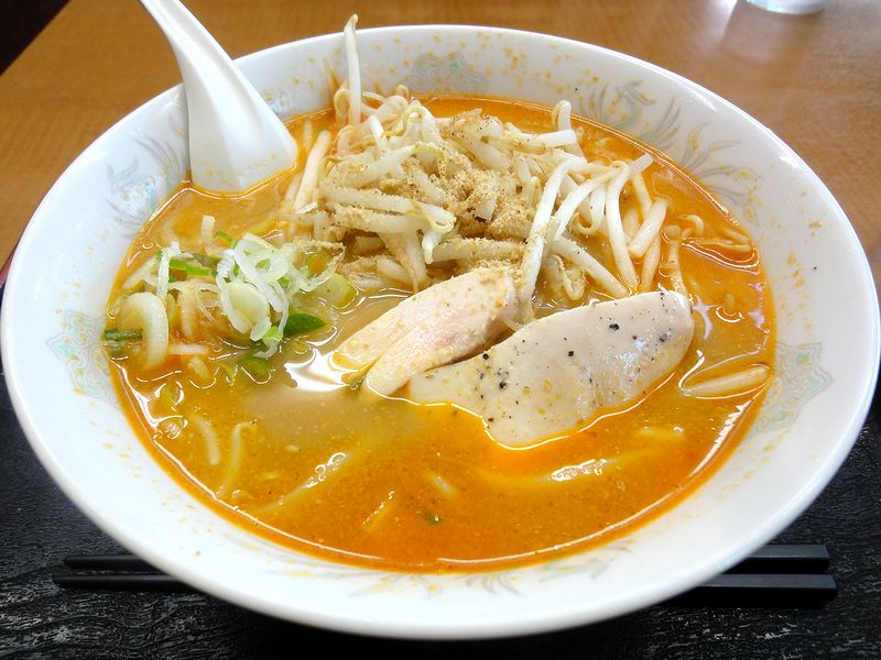 こちらは、同行者のいただいた物。一見担々麺っぽい感じがしましたが、例によって味見させて貰ったところ、胡麻の効いたあっさり目のラーメンという感じで、具のもやしが、さらにサッパリ感をプラスしているような。また、皮や脂が全く付いていない鶏肉が具として入っており、全体的にヘルシー感をアピールといった感じのメニューでしょうか。