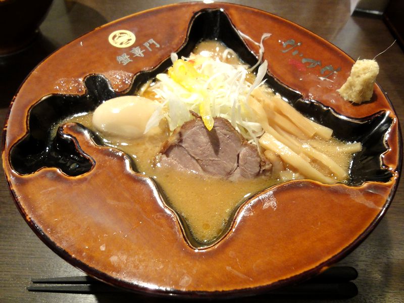 で、列に並ぶ前に食券を購入したのは、こちらのお店の一番人気というこちらのメニュー。食券を出してから待つこと少しで登場したのですが、生で見ると更にインパクトありますね、この丼。ちなみに、網走と知床半島の間のオホーツク海あたりに盛られているのはおろし生姜で、好みで混ぜて欲しいとのことでした。それでまずは、丼から直接は無理なのでレンゲでスープを啜ると、蟹の風味がグっと来ますね。個人的には、蟹の風味と旨味を加えた札幌あたりの味噌ラーメンという感じがしたのですが、かなり味が濃いめなところも、そんな印象に繋がったのかもしれません。また麺は、縮れの入った中太の物。加水率低めの硬質な食感が、こちらも札幌あたりのラーメンを思い起こさせます。あと具は、挽肉とモヤシホロッとした食感のチャーシューと、ねっとりした黄身の具合が頃合いの味玉と、細目であっさりしたメンマ、そしてモヤシや挽肉など。また、上に載った柚子が、濃いスープの中で良いアクセントになっているように感じました。そして、途中から前述のおろし生姜を投入してみたのですが、元のスープが大変しっかりしているせいか、全部入れても生姜にもっていかれることなく、良いアクセントという感じですね。