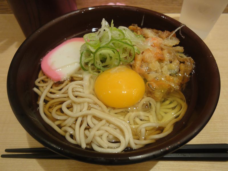 で、いただいたのが、個人的定番のこちら。関西風を謳うつゆは、確かに、濃口醤油の風味が控えめなのですが、塩気は結構強め。途中で生卵を崩しても、全く物足りなさは感じ無いどころか、まだまだ主張してきます。また甘味は控えめで、個人的には、昔ながらの好きな味というか。蕎麦は、箱に入った茹で麺で、ソフトな食感が個人的には嬉しいです。このテのそばはやっぱり、こうでないと。そしてかき揚げは、わりとハードなタイプ。具は定番の玉葱、人参などですが、小海老が乾燥のちっちゃい物ではなく、ちゃんとした海老だったのが嬉しいです。