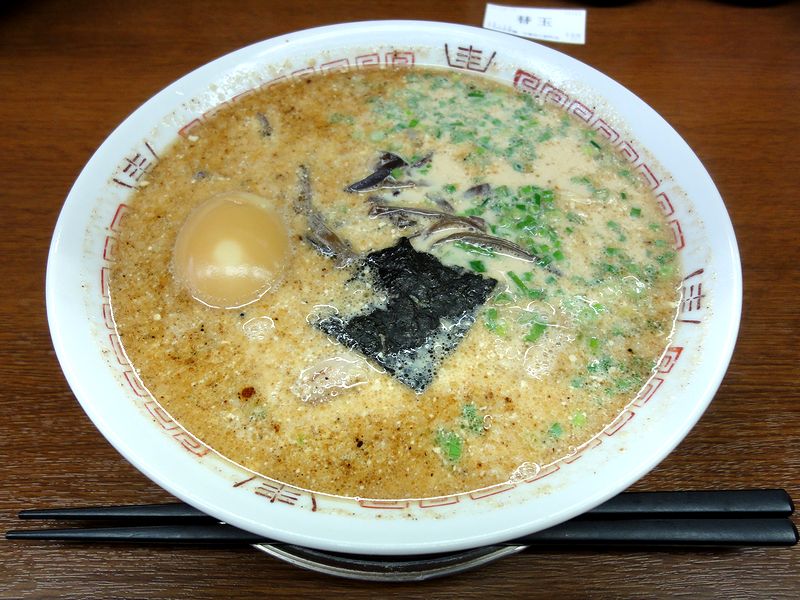それでいただいたのは、お店イチオシのこちら。注文というか食券提出時に、麺の固さは8種類、味の濃さと油の両は3種類から選べるのですが、とりあえず最初は全部普通でお願いしました。で、それから程なくして登場したラーメン。まずはスープを啜ると、クリーミーですがしつこすぎない豚骨をベースに、節系とマー油がうるさすぎず良い感じで効いています。また、豚骨醤油味ですが醤油もそれほど主張せず、何ていうか、九州の豚骨ラーメンをベースに上手いところでバランスが取れているという感じがしました。そして麺は、長浜ラーメンを思わせる低加水の極細麺。固さ普通だとそれほど歯応えは感じず、かといって柔らかすぎず。それと具は、薄切りのチャーシューが結構良いお味。そして味玉は、黄身の固さが丁度良く、味加減も濃い目ですが良い感じですね。