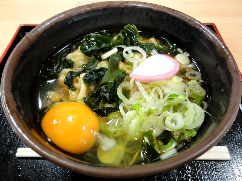 で、いただいたのは個人的定番のこちらなのですが…。まず、出来たそばを取りに行って驚いたのは、かき揚げの下から覗く冷凍物のそばが、冷凍時の四角い形状のまま丼に入っているではないですか。(湯切りは?)おかげで量が少なめのつゆは、たっぷり含まれたゆで汁の影響を受け、そばをひと啜りしただけで白く濁ってしまいました。それでも、味の濃さは生卵を崩しても十分で、甘味と塩気のバランスなども好ましく思えたのですが。ちなみに具のかき揚げは、フワッとしたタイプ。油っ気はあまり感じず、つゆとの馴染みも良い、このテのかき揚げの中ではマトモな物かと。