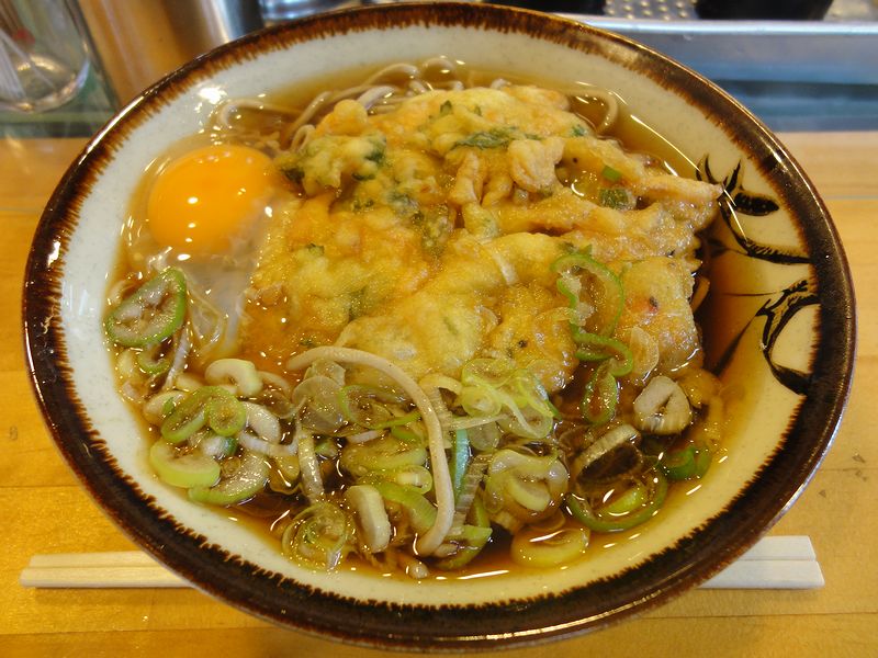 で、いただいたのが個人的定番のこちら。色が真っ黒なつゆは、濃いめのしっかりとした味。個人的には、余計な甘味がないというか、甘味と塩気のバランスが丁度良く、好きな味ですね。ちなみに、女将さん?が時々味を見つつ、煮詰まってくると適宜だし汁を追加投入しているようでした。また蕎麦は、立ち食いそばとしては標準的な茹で麺。最近はだいぶ冷凍麺が増えてきたのですが、個人的にはこの茹で麺のソフトな食感が大好きなので、何とも嬉しいですね。そしてかき揚げはソフトなタイプで、溶けはしませんがつゆと良く馴染む感じでした。