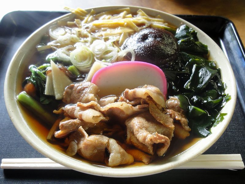 麺の上には、豚肉、山菜、ワカメ、椎茸、錦糸玉子などの具材が所狭しと乗っています。それで早速つゆからいただいてみると、甘味の効いた濃いめの味付けですね。蕎麦は、緑がかった細目のもの。何で緑色になっているのかは残念ながらわかりませんでした。そして具は前述のとおりなのですが、豚肉と椎茸は甘辛く煮含められており、そのうち豚肉には生姜が効いていたというか、それが丁度良いアクセントになっていました。