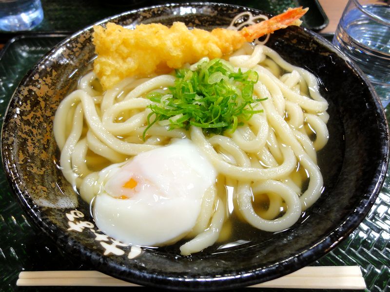 それでいただいたのが、かま玉を注文しようとしたところ12~3分かかると言われ、動揺して訳も判らずに注文・皿に載せたのがこちらの品々。まずはつゆというかだしは、食べやすい讃岐風の味付けで、一口啜った瞬間に、久しぶりにもかかわらず「うん。はなまるうどんだ。」と思える安心の味というか。うどんは茹で置きですが、わりとコシが。ちなみにかま玉だと茹でたてになったんですがね。それと具としてチョイスした海老天は揚げでからだいぶ時間が経った物ですが、立ち食い感覚でいただく分には問題ないかと。