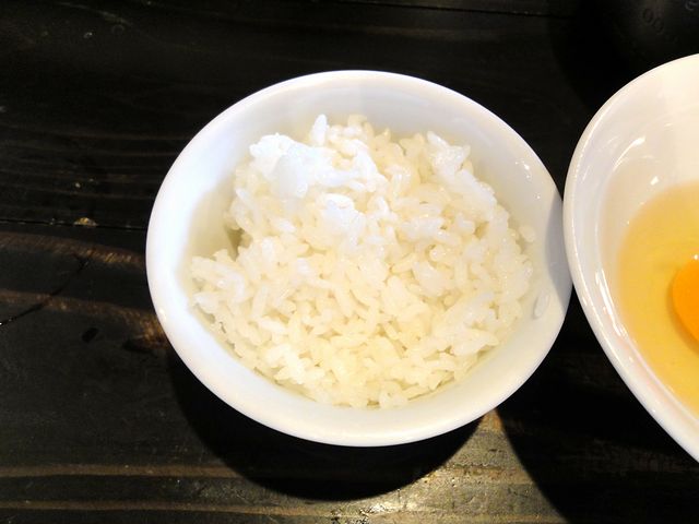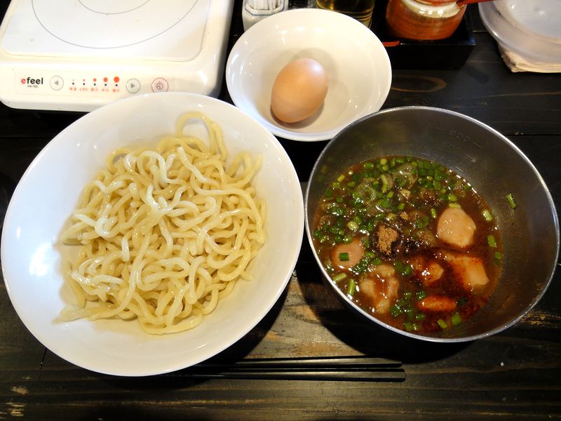 で、いただいたのはこちら。ちなみに、麺大盛りでも同料金なのですが、そこは(当時)ダイエット中ゆえささやかな抵抗ということで。また、あつもりもできるそうなのですが、今回は冷やでお願いしました。それでまず麺は、ぶっとくて、縮れの入ったかなり硬質な食感の物。最初の1本は何も付けずにいただきましたが、噛むとかなりの歯応えがあり、噛み切ろうとするとぬちっと重たく切れる感じがします。また、ステンレスの器に入った付け汁は、超濃厚な豚骨魚介がベース。そこにかなりハッキリとした甘味と、注文時(というか食券提出時)に尋ねられた秘伝のスパイスの辛味がバチッと効き、更にはニンニクの風味をギンギンに感じる、かなりインパクトのある、大変判りやすい味かと。最初は正直少なめに感じた付け汁の量も、この濃さなら充分というか、一般的な量だと味がくどくなりすぎると思いますし、カロリーも天文学的になりそうですね。それとナイスだと思ったのが、卓上にはIHヒーターがあり、付け汁が冷めてしまった時は器ごとそこに載せれば、スイッチを入れて1分も経たないうちに熱々にすることが可能です。あと具は、プリプリのホルモンが数個。これがつけ麺に合うというか、このハードな味の構成の中、しっかりと存在感があります。おじや作成中そして、麺を食べ終わった後は、卓上の割りスープで付け汁を適宜薄め、サービス(1人1個まで)の生卵とライスを貰い、先述のIHヒーターで加熱して雑炊に。やっぱり最後はライスで〆ると満足しますね。それにしても、結構薄めたつもりなのにかなり濃い味になってしまいました。(もちろん割りスープ追加投入しましたが、元々すごい濃さだったというか。)