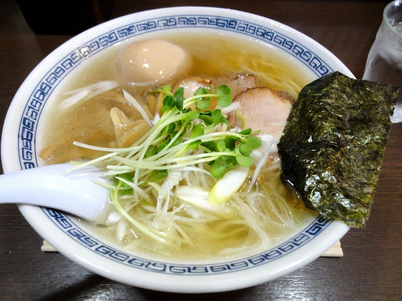 で、いただいたのは、各種ラーメン本やネットでも評判の良い塩らぁ麺に玉子を追加して。僅かに濁りのあるスープは動物系と魚介系素材の風味や旨味がじんわりと出ていて、そこに表面に浮く動物系の油が絡み、更に丁度良い塩気と相まって、何とも絶妙というか、あっさりしているけど滋味深い、とてもバランスの取れたお味かと。また細目の麺は自家製麺との事ですが、啜り心地と硬質な食感が、このスープに良く合っていますね。そして具は、まず、チャーシューが絶品。そしてメンマも、派手さはないけどキッチリと作られている印象。そしてカイワレや刻んだ白ネギ、そして海苔がアクセントになっているのですが、どれも単独で主張しないというか、ラーメンの一部として実に良くまとまっている印象です。また、追加の玉子は、黄身がトロッとしたタイプでとても良い塩梅でした。