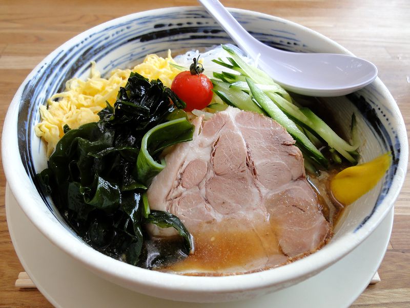 こちらは、同行者がいただいたもの。見た目は、一般的な冷し中華とはちょっと違うと思うのですが、いただいてみても、ベースは甘酸っぱい醤油ダレを使った一般的な冷し中華を思わせるものの、そのタレがわりとたっぷり入っていて、味もマイルドというか、個人的にはゴクゴク飲めてしまうくらいの味で、個人的には結構気に入りました。