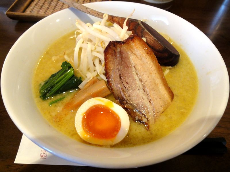 こちらは、先日まで提供されていた『濃厚○○味噌つけ麺』シリーズの、いろんな意味で濃厚なつけ汁に似たスープのように感じました。個人的にはナッツ類を連想する深いコクと白味噌が絡み合い、更にコックリとした味になっているのではないかと。また麺と具は白味噌ラーメンと共通ですが、味の方向性は別というか、こちらはこちらで、良いですね。
