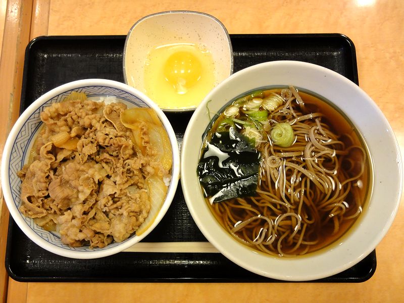 牛丼と十割そばセット(かけそば・牛丼並盛) 680円 + 玉子 50円