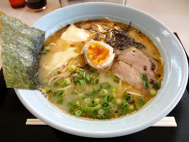 スープは名前のとおり豚骨スープ。基本的にはサラッとしたクセのないタイプなのですが、様々なスパイス類や豚骨スープの旨味と相性の良いチーズなどの追加アイテムで、何とも奥深い味わいです。また麺は、店主さんオススメの固茹ででお願いしましたが、細くて歯応えのある麺が旨いですね。また、チーズと絡めていただくと、これがまた。そして具は、注文毎に丁寧にフライパンで暖めるチャーシューと、半熟具合が絶妙(個人的には、トロトロよりこれくらいの方が好みかも)の味付け卵。それに前述のチーズに、九州の豚骨ラーメンっぽいキクラゲなど。というわけで、熊本っぽくもあり、細い麺は博多の長浜っぽくもあり、チーズなど店主さん独自の改良もあって、とても美味しい一杯だと思うのですが。