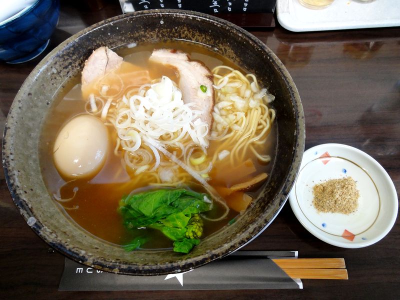 で、いただいたのは、夜刃専用メニューのうち醤油味のこちら。スープは、あっさり魚系という感じでしょうか。メインのダシはサンマ節とのことですが、サンマ独特の風味は抑麺のアップえつつも上手に旨味は残されていて、かなり食べやすい印象です。また麺は、こちらのラーメンに共通の中細ストレート麺。ボリッとした食感は、こちらのスープにも結構合っているように感じました。そして具は、柔らかくも歯応えがあり味付けも良い塩梅という好みどストライクなチャーシュー(部位が違うところを1枚づつ)と、玉ネギと白ネギ、そしてメンマに、季節の青菜(今回は菜花でした)。また、味玉は、卵の味が濃くて美味。あと途中から、添えられた焼きアジ粉末を投入すると、それまでの食べやすい味がアグレッシブに豹変。もう、魚がビシビシ来るというか。この二面性が面白いですね。