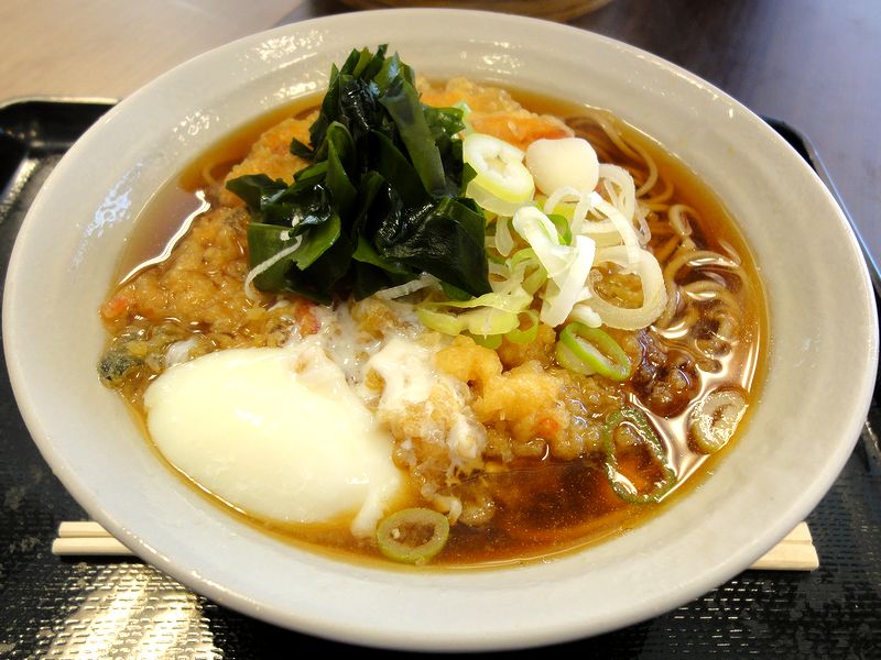ということで、思わぬかたちで茹でたての蕎麦をいただけたのですが、(こういうところの蕎麦でも)やっぱり茹でたては美味しいですね。そばの香りはちゃんと感じられますし、何より歯応えが良いかと。また、つゆは、醤油とダシの効いた、それほど甘味のない硬派な感じ。そして具のかき揚げは、溶けるようなタイプではないのですが、つゆとの馴染みは良好。あと卵は、特に指定しない場合生ではなく半熟卵になるのですね。