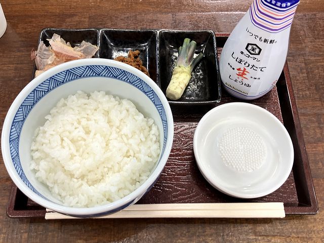 注文からあまり待たずに、まずは生わさびごはんのセットが登場。可愛らしいサイズのワサビの他、調味用の醤油、そして鰹節とカツオかマグロのフレーク様のものが添えられています。そのワサビを陶器製おろし金ですりおろしていると、程なくしてそばが登場しました。