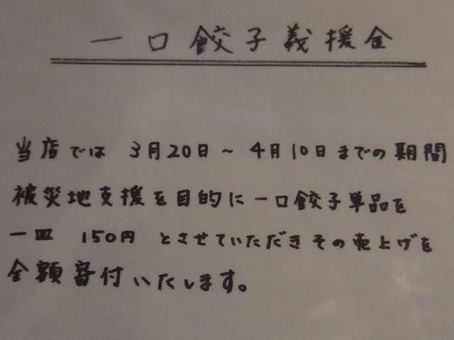 前回こちらにお伺いした時の記事で、こちらで個人的に一番好きなメニューは味噌拉麺と書いたとは思うのですが、実は、このピリ辛味噌も、それに並ぶくらい好きだったりして。昔のビールのキャッチコピーではないのですが、コクがあるけどキレがあるスープに適度な辛味が効いていて、そこに(個人的にはすっかり馴染んだ)もっちり全粒粉麺が絡むと、もう。しかも今回は贅沢にも赤ネギをトッピングしたので、そちらの味と辛さも加わって、また違った味わいですね。ちなみに、この赤ネギ。トッピングとは言っても別皿でたっぷりと提供されますので、一部を小ライスに移植してピリ辛なネギ丼にしていただくと、これがまた美味しかったです。そして最後は、残ったスープに残った小ライスを投入。ピリ辛味噌の場合も、前回いただいた味噌拉麺同様に噴火飯ではなく残りスープにライス投入が一番美味しい堪能の仕方だと、個人的には思っているのですが。あと一口餃子は、なんとその売り上げを全額被災地に寄付されるということで注文させていただきました。ちなみにお味の方は、以前いただいた時同様、このお値段でいただけるのが勿体ないくらいのちゃんとした味。それにしてもこの義援金は、お店にしてみれば一口餃子を無料で提供しているようなものだと思うのですが、こちらの店主さんには本当に頭が下がります。