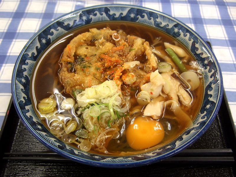 つゆは、まだ関東というか東日本ライクな黒っぽいもの。塩気は丁度良く感じました。また、そばは冷凍っぽい食感のもの。そして 天ぷらは標準的オイリーさ加減で、つゆに溶けるというより歯応えを残しつつボロボロと柔らかくなる感じ。それと、キノコと山菜の水煮が入っているのが珍しいですね。