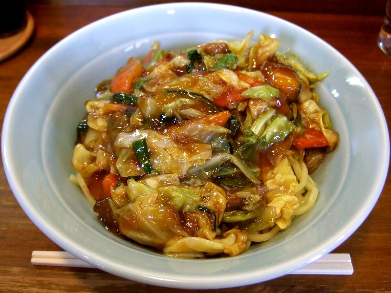 それで、前回がホット(お店の符丁でスタミナラーメンの事らしい)だったので、今回は冷しを(前回同様大盛りで)いただく事に。で、そのスタミナ冷しなのですが、いわゆるスタミナラーメンのスープが無く麺が冷たいバージョンなのですが、スタミナラーメン以上に、麺そのものと、スタミナラーメンのキモである餡かけの味が、よく解るような気がします。それにしても、こちらの餡かけは、しっかりと作ってありますね。その甘味と、適度な辛味の効いた餡を、冷たくシコシコの麺とからめていただけば、もう。待った甲斐があったというか、納得の美味しさでした。