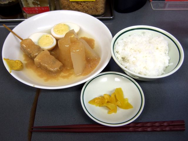 そして、もう一つのこちらの名物であるおでんですが、今回お願いしたセットだと、豚串、大根、玉子が各1つづつ盛られていたのですが、どれも良く出汁が染みていて、あっさりとした味付けが良いですね。また、豚串と大根には生姜の風味が効いた味噌ダレが掛かっていたのですが、これがまた丁度良いアクセントになっているというか。これはご飯でも良いのですが、個人的には、ちょっとお酒が欲しくなる味というか。ちなみに、こちらには焼酎を甘い葡萄酒で割った『赤割』というお酒があるそうなのですが、クルマでなければそれも是非いただいてみたいところでした。