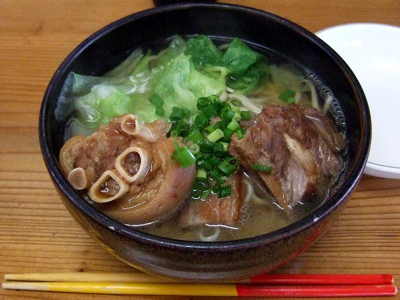 で、店内に入りお品書きを見ると、そば類の他に定食(ポーク卵のように当地独特の物なども)や丼物などまさしく大衆食堂の趣なのですが、その中にお店の名前を冠した西原そばというのがあったので注文。程なくして運ばれてきたものは、大盛りのそばの上に、テビチ(豚足)、ソーキ(豚あばら肉)、三枚肉(豚バラ肉)が一つづつと、沖縄そばの具としては個人的に初めて見るレタスが載っていました。それで早速いただいてみると、そばは個人的に沖縄そばからイメージするゴワッ・ボソッとした啜り心地・噛み心地ではなく、中華麺に近い食感で食べやすい印象。また、灰汁っぽい風味も感じられないので、鹹水を使って製麺したものでしょうか?またつゆは、それなりに調味料感もありますが、だしの香りも感じられ、そばと同じく食べやすい印象。そして具は、テビチは皮がトロっとしていて、ソーキはホロっと骨から外れ、三枚肉はプリッとした食感で、どれも丁度良く味付けられているように感じました。また、レタスがそばと結構合っているというか、ボリューミーな肉系の具の、丁度良い箸休めになっているのが良かったです。