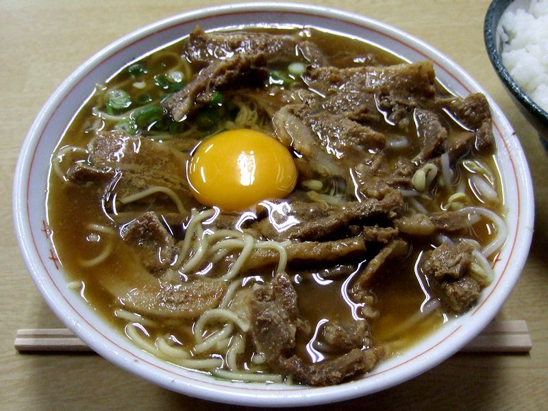 こちらが私がいただいたものたち。まずは中華そば肉入ですが、お品書きには(中)とあるけど、個人的にイメージする「中盛り」よりも量は少なめ。こちらのお店は中華そばのサイズが(大)と(中)の2種類しかない事から考えると、並とか普通盛りに相当するのが(中)なんですね。と、前置きが長くなりましたが、早速スープを啜れば、豚骨のコクが十分に出た、なんとも丸みのある醤油味。甘味は控えめというか自然な甘味で、また、徳島ラーメンはご飯のおかずとして食べられる為スープの味が濃いと事前に聞いていたのですが、個人的には丁度良く(私が、塩辛いのが大好きな栃木県民な所為もあるかと思いますが。)感じました。そして麺は、中~若干細いくらいの太さのストレートタイプで、食感は柔らかめ。というか、ゴリゴリ固い麺だと、このラーメンには合わないでしょうね。あと具は、徳島ラーメンの特徴である、甘辛く煮た豚バラ肉。しっかりと濃い味が染み込んでいますが、こちらもスープ同様、甘味はあくまで自然な感じ。それと、地元の方は必ずしも入れないという生卵は、予想通り豚肉に絡めていただくと美味なんですが、玉子を溶いてもスープの味があまり変わらないのは、元々のスープがしっかりしているのかなぁ、なんて思いました。で、このラーメンをおかずにいただく白米は、何とも美味というか、実に良く合っていました。