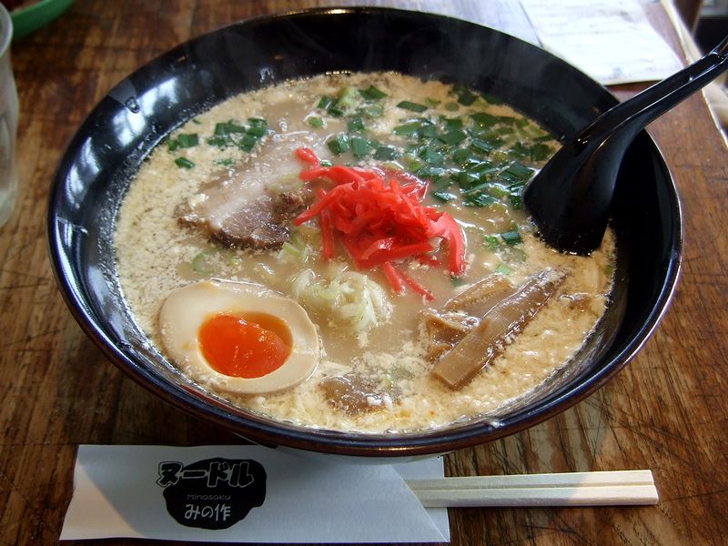 お店に入ると、先客が何組か。観光客と地元っぽい方が半々と行ったところでしょうか。それで注文は食券制とのことで、早速カウンターで私と相方の分を購入。空いていたテーブル席に座ると、待つこと少々でラーメンたちが登場しました。